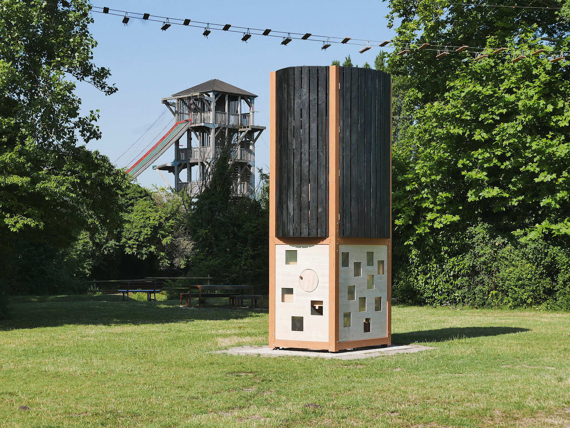 Au fort de Petite-Synthe, Cariiiillon prend la forme d’une cabane, rappelant les klockhuis flamands*, les constructions spontanées des enfants dans la forêt et les tours créées par Anthony Caro dans l’œuvre Chœur de lumière située dans l’église Saint JeanBaptiste de Bourbourg. Cet abri, à la fois structure architecturale et instrument de musique, accueille en son centre un carillon tubulaire de 24 notes, invitant les visiteurs à une expérience sonore interactive.